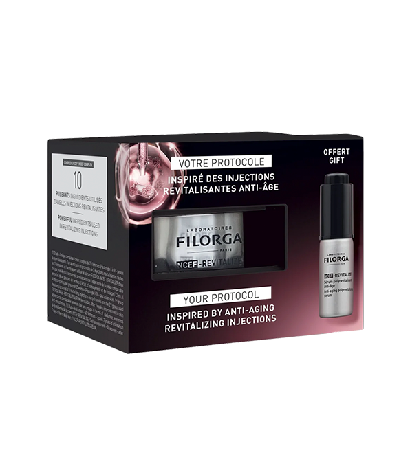 Este set contiene: -Filorga NCEF-Revitalize Crema Efecto Reafirmante Polirevitalizante 50ml, crema con acción revitalizante que actúa sobre la calidad de la piel para alisar, reafirmar e iluminar. Formulada con el nuevo complejo NCEF, un complejo revitalizante único desarrollado por los expertos de los Laboratorios Filorga, compuesto con 10 de los principios activos más potentes utilizados en mesoinyecciones. Combinado en una nueva generación de tecnología de encapsulación para una mejor penetración de los activos en la piel. También contiene un polisacárido, 5 tripéptidos y extracto de Flor de Orfeo para una eficacia antiedad reforzada. -Serum polirrevitalizante antiedad, serum con acción revitalizante que actúa sobre la calidad de la piel tan eficaz como un protocolo de inyecciones revitalizantes para alisar, unificar, iluminar.