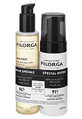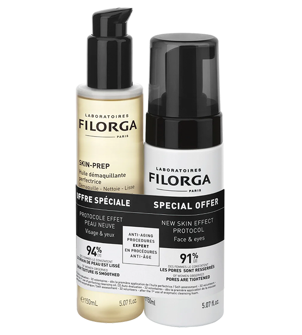 Filorga Pack Duo Skin Prep Aceite Desmaquillante 150ml + Mousse Enzimático 150ml es un conjunto de productos de limpieza facial que ofrece una limpieza profunda y eficaz, preparando la piel para el cuidado posterior. El aceite desmaquillante elimina suavemente el maquillaje y las impurezas, mientras que el mousse enzimático realiza una